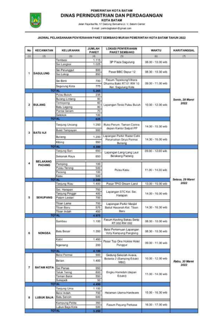 Adapun jadwal sembako murah di antaranya pada Senin 28 (28/3/2022) di Kecamatan Sagulung, Bulang dan Batuaji. Selasa (29/3/2022) Kecamatan Belakangpadang dan Sekupang.