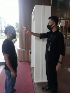 Protokol kesehatan langsung diterapkan begitu pengunjung memasuki area resepsionis usaha hiburan malam itu. Jika biasanya pengunjung langsung dipersilahkan masuk, kali ini pengunjung diwajibkan melewati gerbang masuk yang dilengkapi thermo scan.