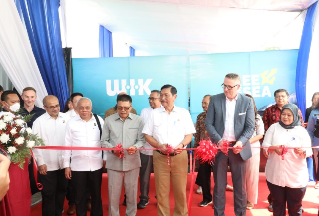Grand Launching PT Free The Sea ditandai dengan pemotongan pita oleh Menteri Koordinator Bidang Kemaritiman dan Investasi Luhut Binsar Pandjaitan, pada Kamis (9/3/2023) bersama dengan Mr. Markus Steckhan, Chief Strategy Officer of WIK Group.